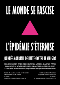 Dimanche 30 novembre : journée mondiale de lutte contre le VIH-Sida – Manifestation 14h, à Paris Opéra 2025-11-30T13:25:35+01:0026 novembre 2025|Catégories : À LA UNE, Action, Santé et protection sociale|Mots-clés : ACTIONS| Partagez cet article ! FacebookXWhatsAppTelegramEmail Articles similaires Colloque sur les 80 ans de la Sécu : mercredi 3 décembre, Bourse du Travail, salle Hénaff, 29 boulevard du Temple à Paris Colloque sur les 80 ans de la Sécu : mercredi 3 décembre, Bourse du Travail, salle Hénaff, 29 boulevard du Temple à Paris 26 novembre 2025 Toutes et tous en grève le 2 décembre : RDV à Paris 14h Métro Bourse Toutes et tous en grève le 2 décembre : RDV à Paris 14h Métro Bourse 19 novembre 2025 Transports des élèves en situation de handicap : Rassemblement devant le Conseil Régional mercredi 19 novembre à 17h Transports des élèves en situation de handicap : Rassemblement devant le Conseil Régional mercredi 19 novembre à 17h 14 novembre 2025 Le Tour de France pour la Santé lance son appel : Soigne ta santé, défends ta sécu ! Le Tour de France pour la Santé lance son appel : Soigne ta santé, défends ta sécu ! 14 novembre 2025 La FSU engagée pour les droits des femmes : le 22 novembre et le 25 novembre dans la rue ! La FSU engagée pour les droits des femmes : le 22 novembre et le 25 novembre dans la rue ! 14 novembre 2025