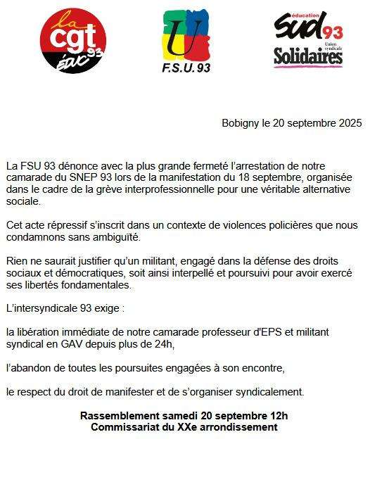 La FSU IDF s’associe pleinement aux communiqués de l’intersyndicale 93, du SNEP-FSU et de la FSU 93 pour dénoncer avec la plus grande fermeté l’interpellation de son camarade du SNEP-FSU 93, arrêté à Nation lors de la manifestation interprofessionnelle du 18 septembre. La FSU IDF apporte tout son soutien au camarade et appelle à rejoindre les rassemblements de soutien :