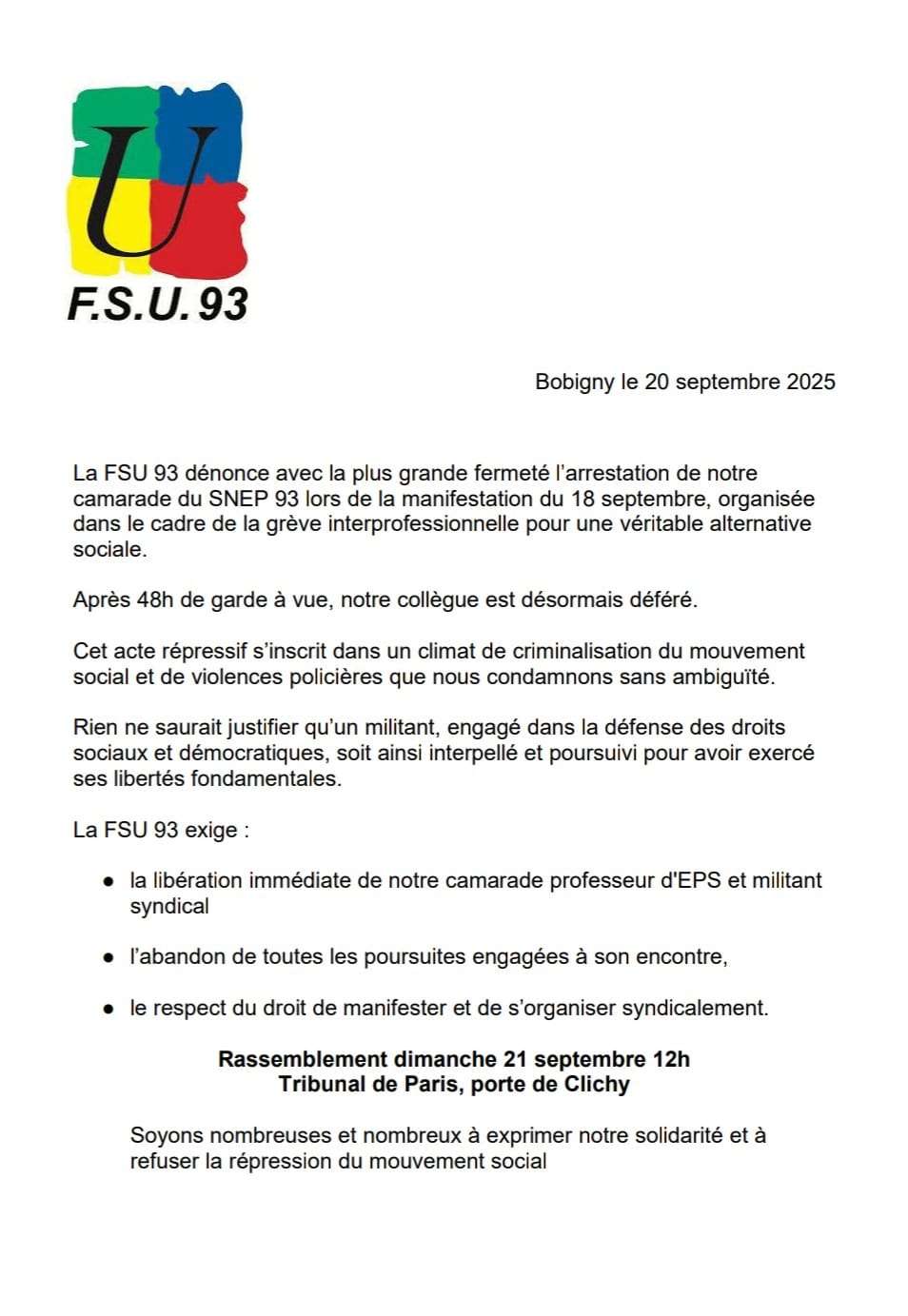 le dimanche 21 septembre, à 12h devant le tribunal à Paris Porte de Clichy.