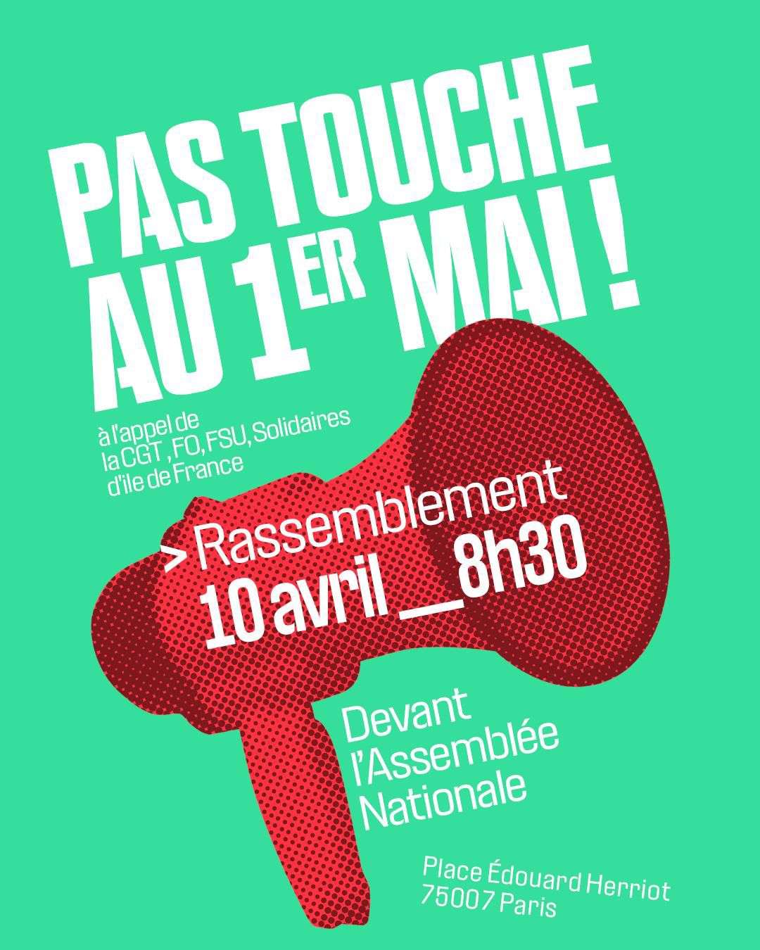 La FSU appelle à participer aux mobilisations du 10 avril contre la PPL visant à faire du 1er mai un simple jour férié plutôt qu’un jour chômé ; régression autant symbolique que réelle pour les droits des travailleurs et les travailleuses.  Le rassemblement régional aura lieu le vendredi 10 avril à 8h30 devant l’Assemblée Nationale à Paris.